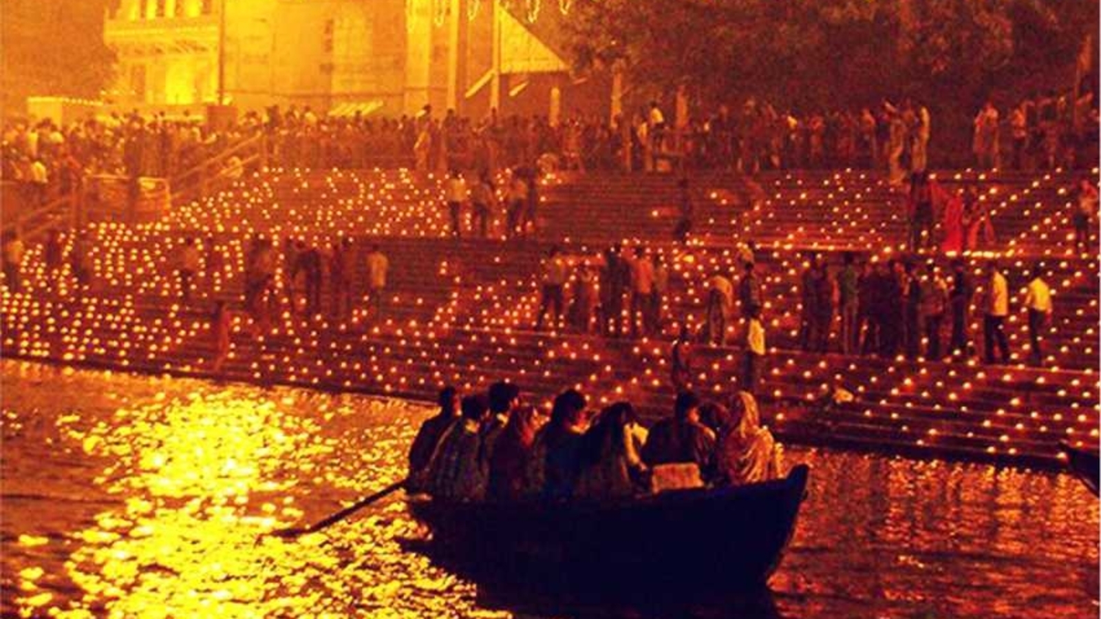Beautiful evening on the Boat As whole city, especially most of the Ghats get immersed into the light of earthen lamps. A boat ride gives an opportunity to tourist a full view of amazing scenes of cities and monuments that are decorated on Dev Diwali.